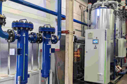 Sur le site evian, comme dans la majeure partie des entreprises de l’industrie alimentaire et de boissons, l’air comprimé utilisé pour les différents process doit être exempt de contaminants, qu’ils entrent en contact ou non avec les produits. Le site evian travaille aujourd’hui à optimiser la production des utilités, y compris l’air comprimé utilisé dans les process d’embouteillage de son eau. À Amphion, les chaînes de mise en bouteille sont alimentées par l’air comprimé qui sert au soufflage des bouteilles en PET. La production d’air comprimé compte pour 23 % de la consommation d’énergie globale de l’usine, d’où le besoin de Fabrice Ajello de moderniser l’installation d’air comprimé par un système à haute efficacité énergétique. L’installation existante engendrait un problème de continuité de service : les deux compresseurs précédemment installés fonctionnaient avec des sécheurs frigorifiques refroidis par air. Fabrice Ajello explique : « L’été, les anciens sécheurs fonctionnaient moins bien à cause des fortes chaleurs (air chaud ambiant), qui les faisaient tomber en défaut. Ensuite, en mode régulation, ces sécheurs s’arrêtaient et, au redémarrage, ils généraient un air trop humide qui arrivait jusqu’aux souffleuses, provoquant des arrêts réguliers de production et une augmentation des coûts d‘exploitation. En outre, l’humidité dans les réseaux est une source potentielle de pollution microbienne. »