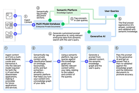 3. Amélioration de l’invite : lorsqu’une requête utilisateur est reçue, le graphique de connaissances encadre l’invite, fournissant à l’IA générative le contexte nécessaire pour générer des réponses précises.