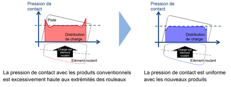 Avec un roulement classique, une pression de contact excessive aux extrémités des rouleaux est inévitable, ce qui incite généralement à choisir de plus grands roulements pour supporter les fortes charges. En revanche, la pression est uniforme avec le nouveau roulement à rouleaux, ce qui élimine le besoin de surdimensionnement et se traduit, à conditions d’utilisation identiques, par un allègement de plus de 30%.