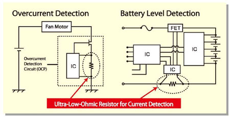 Dans les applications de détection de courant, en général, les résistances sont utilisées pour détecter les sur-intensités ou le niveau de batterie restant. Par ailleurs, même si les résistances de détection de courant sont couramment utilisées dans les secteurs automobile et industriel, la récente tendance visant à mettre l’accent sur la sophistication et l’informatisation a engendré une augmentation des besoins en courant, d’où la nécessité de recourir à des composants à grande puissance. Il existe donc une demande en résistances haute précision offrant non seulement un meilleur coefficient de température de résistance (CTR), pour un fonctionnement stable dans les environnements à température extrême, mais également des valeurs de résistance ultra-faibles afin de limiter la consommation.