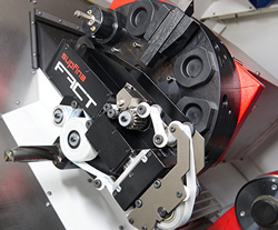 Il est piloté par un entraînement central qui est relié à la tourelle du tour. Il ne nécessite aucun raccordement supplémentaire pour les fluides, car la lubrification se fait directement par la tourelle. L’appareil peut être adapté à différents systèmes de tourelle et offre, grâce à un engrenage spécial, la possibilité d’un arrêt de l’oscillation pour des usinages simplifiés. Le traitement de matériaux durs et de revêtements avec une bande de superfinition diamantée est également possible.