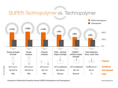 En remplacement du métal, les " SUPER- Technopolymères " représentent l’évolution la plus récente dans l’ingénierie des polymères. Grâce à la présence de taux élevés de fibre de verre liée aux polymères de base avec des amorces et/ou la présence de fibres synthétiques d’aramide appropriées, les « SUPER-Technopolymères » sont caractérisés par des propriétés mécaniques et thermiques très supérieures aux polymères traditionnels (voir ci-dessous le tableau SUPER- technopolymères vs Technopolymères).