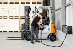 Ils sont tous équipés, en standard, de batteries lithium-ion et peuvent ainsi, via une prise latérale facilement accessible, être rechargés d’une manière pratique et rapide. Cette technologie permet aussi des recharges intermédiaires à tout moment assurant ainsi une disponibilité et une flexibilité maximales des chariots.