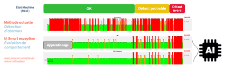 L’IA Smart Exception assiste les experts en analysant ces signaux et en identifiant les anomalies pertinentes. Grâce à l’apprentissage automatique et à une modélisation des comportements vibratoires, il affine la détection des défauts. Cette approche réduit significativement les interventions inutiles tout en maintenant un haut niveau de vigilance pour éviter les pannes critiques.