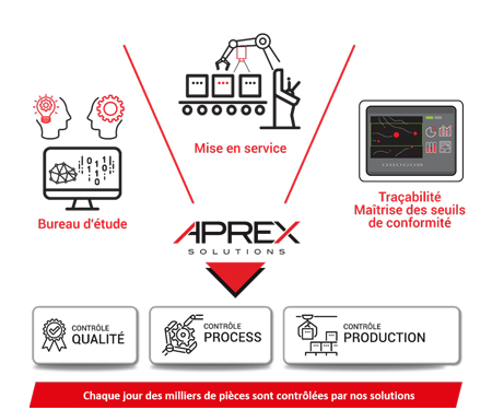 L’innovation d’APREX réside dans un outil unique et ergonomique capable de combiner ces différentes méthodes d’analyse, de créer et d’entraîner des IA basées sur des réseaux de neurones de pointe, et de piloter diverses technologies de captation : 2D, 3D, infrarouge, hyperspectral... Ces dispositifs s’intègrent dans tous les environnements, même complexes, gèrent les cadences élevées, détectent des défauts de l’ordre de quelques microns, et s’interfacent aisément avec les interfaces homme-machine, automates, robots et IoT de production.