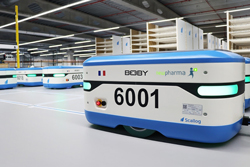 Le travail des préparateurs de commandes dans les entrepôts de commerce en ligne est exigeant d’un point de vue physique. Ils parcourent jusqu’à 15 km par jour pour aller chercher sur les étagères les produits dont ils ont besoin pour répondre aux commandes. Afin d’alléger la charge de travail des employés et d’augmenter leur performance, l’entreprise française SCALLOG a mis au point « Boby ». Le robot logistique autonome peut transporter seul des étagères jusqu’au poste de préparation de commandes, ce qui permet de réaliser jusqu’à 450 picks par heure. Plusieurs robots peuvent aussi travailler en essaim, ce qui permet d’augmenter la capacité d’automatisation de manière flexible. Cela mène multiplier la productivité par 2 voire 3 selon SCALLOG. Cette solution est désormais utilisée non seulement dans le e-commerce, mais aussi dans l’industrie, par exemple chez Decathlon, Farmy, Bricolux et le groupe Blondel ou encore dans la cosmétique, la pharmaceutique et par les logisticiens.