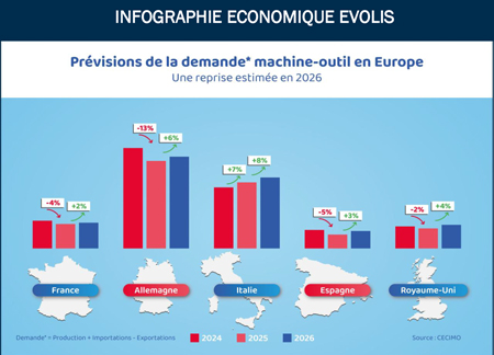 Finalement, la consommation de machine-outil en Europe devrait se stabiliser en 2025 (-0,8 %) après une forte baisse en 2024 (-13,7 %). La demande devrait repartir d’ici début 2026 pour une grande majorité des pays européens.