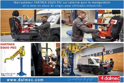 Dans ce cadre, et toujours à la pointe de l’innovation, Dalmec est heureuse de présenter une nouvelle version de son manipulateur de type Partner Equo PEC conçu sur-mesure pour assurer la prise, le déplacement, le positionnement et la dépose des sièges automobiles de véhicules industriels sur les lignes de montage.