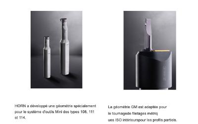 HORN élargit son système Supermini avec des géométries frittées d’une nouvelle variante pour le filetage. La géométrie GM est adaptée pour le tournage de filetages métriques ISO intérieurs pour les profils partiels. La géométrie de forme des copeaux permet d’obtenir des copeaux courts, même avec des matériaux difficiles à usiner et à copeaux longs. Cela réduit le risque d’accumulation de copeaux, empêche les copeaux de s’enrouler autour du porte-outil et augmente ainsi la sécurité du processus. De plus, le bris de copeaux facilite la manipulation des copeaux. Les plaquettes de coupe conviennent pour les filetages métriques intérieurs à partir d’un diamètre de passage de 5 mm dans des pas de 0,5 mm à 1,5 mm. Les porte-outils standard du système Supermini sont disponibles.