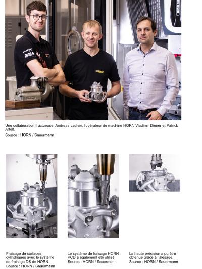 Les tolérances de fabrication sont de l’ordre de 0,007 mm. Avec seulement quatre pièces brutes livrées et quatre pièces finies requises, il n’y avait aucune marge d’erreur. Outre la conception des outils adaptés, la programmation et le savoir-faire de l’opérateur de la machine ont été déterminants. 27 outils HORN différents sont utilisés pour les différentes opérations d’usinage des deux serrages. Il s’agit notamment d’outils à tête à aléser, d‘alésoirs, de fraises PCD et d’outils de fraisage.