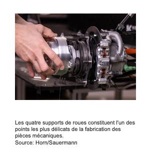 L’un des principaux défis pour la fabrication des pièces mécaniques est constituéì par les quatre supports de roue. Ceux-ci servent à loger les moteurs électriques et les réducteurs planétaires qui transmettent le couple directement aux roues. Les supports de roue présentent une géométrie complexe.
