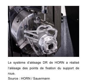 De nombreux systèmes HORN ont réalisé d’autres étapes d’usinage délicates. Parmi eux, une fraise à insert PCD. Elle a pris en charge, en un seul serrage, le fraisage du diamètre destiné à recevoir le moyeu de roue. Ce choix s’est imposé en raison de la longueur de coupe et de la qualité de surface requise. Le système de d‘alésage DR de HORN a également été utilisé. Il a réalisé l‘alésage des points de fixation du support de roue.