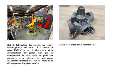 Au-delà de la machine, le bureau d’études de PCI conçoit l’ensemble du processus d’automatisation. Celui-ci repose sur un robot de chargement / déchargement des pièces via des convoyeurs, tout en assurant les changements de série conformément aux principes de la méthode SMED (Single Minute Exchange of Dies). Les convoyeurs d’approvisionnement sont équipés de palettes assurant une mise en place répétitive des pièces, ce qui facilite leur préhension par le robot. Les montages de prise de pièce (MPP) de la machine sont stockés dans un magasin vertical et conçus pour permettre des changements de série rapides (point zéro, système de préhension robotisé, etc.). Un système de gravure laser est étudié et mis en œuvre afin de garantir la traçabilité de chaque carter usiné, via un marquage par QR code.