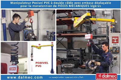 Destinée tout particulièrement aux secteurs de la Mécanique, du Métal, du Soudage et de l’Industrie, la nouvelle version du manipulateur industriel de type Posivel PVC à double câble en exécution sur colonne avec bras articulé a été conçue et développée sur-mesure par Dalmec pour effectuer la prise, la manutention, le déplacement de PIÈCES MÉCANIQUES légères et leur positionnement pour les opérations de soudage.