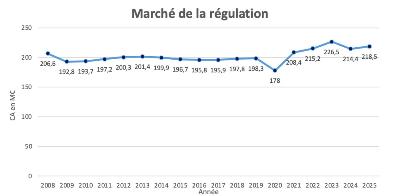 Le marché de la régulation renoue avec la croissance : +1,9% pour s’élever à 218,5 millions d’euros en 2025. Cette croissance modeste constitue néanmoins une satisfaction dans un secteur globalement en forte baisse.