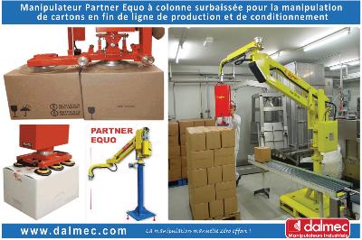 Ciblant notamment les secteurs de l’Alimentaire, la Chimie, la Pharma-Cosméto, le Conditionnement, l’Emballage, les applications intralogistiques, …, Dalmec présente une nouvelle version "métier" de son manipulateur Partner Equo développé sur-mesure pour permettre la prise de cartons en fin de ligne de production et de conditionnement, leur transfert et leur dépose sur palette dans des environnements exigus et à plafond bas.