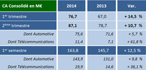 Forte de la montée en puissance de ses systèmes embarqués, l’Automotive, qui représente 86,8 % du chiffre d’affaires global, s’installe dans un nouveau rythme de croissance. Son chiffre d’affaires trimestriel ressort en hausse de 5,7 % par rapport au 2ème trimestre 2013. Sur le 1er semestre, l’activité de la branche s’élève à 143,9 M€, en progression de 9,8 %.