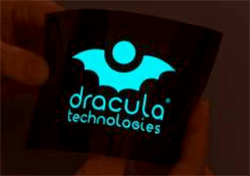 Le procédé mis au point par Dracula Technologies permet de réaliser des cellules photovoltaïques organiques souples par "simple" impression numérique. Ce procédé consiste à déposer de minces couches d’encre sur un film plastique souple (cf annexe 1). En fonction de l’empilement des différents substrats, notamment ceux disposant d’une couche conductrice ou émettrice, le dispositif produit un courant capable d’alimenter les objets nomades (gamme Dracula Power), ou une lumière rendant l’objet qui en est doté électroluminescent (gamme Dracula Lighting).