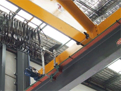 Illustration 2 : Les trois ponts roulants de 22 m de large se déplacent sur des poutres s’étalant sur toute la longueur de l’usine. Leur vitesse et leurs temps de montée de la rampe sont synchronisés.