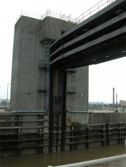 Le système de contrôle est composé de deux unités pompe/moteur de 18,5 kW, chacun avec capacité de service et de secours, qui permettent d’abaisser et de relever chaque porte en 15 minutes. Lorsqu’elles ne sont pas en service, la structure de chaque porte est maintenue en position totalement relevée et est verrouillée grâce à des mécanismes hydrauliques.