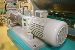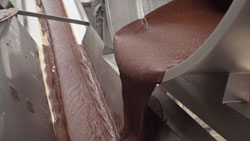 Les graines de cacao sont ensuite décortiquées. Puis un broyeur avec un système d´entraînement de NORD transforme les graines en pâte de cacao liquide, acheminée vers un mélangeur via un système de tuyauterie. Les pompes employées à cette étape sont équipées de motoréducteurs de 4 kW. Dans le mélangeur, du sucre et éventuellement du lait en poudre sont ajoutés à la pâte de cacao. Du beurre de cacao est ensuite versé sur le tout depuis des cuves voisines, équipées de plusieurs systèmes d´entraînements de pompe.