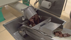 À l’issue du mélange de la masse de cacao avec d’autres ingrédients, on obtient une pâte plus liquide, qui est concassée dans un enrouleur afin d’obtenir une texture fine. Un réducteur à vis sans fin spécial entraîné par un motoréducteur hélicoïdal de 4 kW se charge ensuite de la compression. Basé sur le design NORDBLOC.1, cet entraînement bénéficie d’une conception innovante : les engrenages sont introduits et montés par les alésages de roulement.