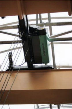 Les ponts roulants sont alimentés par une gaine électrique, fixée à la structure métallique, tandis que chaque palans à câbles EUROBLOC VT3 est alimenté par un câble en guirlande. Une passerelle installée sur le pont roulant permet un accès à l’armoire d’alimentation électrique et facilite les opérations de maintenances et d’entretiens. Conçus sur mesure pour ce bâtiment de 20m de large les ponts roulants permettent un déplacement des palans sur pratiquement toute la largeur. Des fins de courses en butées garantissent la sécurité. Le moteur de levage des palans à deux vitesses et le déplacement horizontal par moteur à vitesse variable garantissent une grande sécurité et une grande précision dans le déplacement des charges.