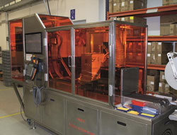 Ainsi, en 2015, grâce à une cadence 3 fois supérieure, la nouvelle machine réalisera 405 000 bagues/ jour, contre 135 000 avec l’ancienne génération, pour atteindre 150 millions de bagues imprimées par an. L’automatisation du process est non-négligeable : un robot lié à la machine permet d’éviter tout contact manuel avec le produit et d’imprimer la plaquette directement. Le process d’impression et de préparation se résume donc en 4 étapes :