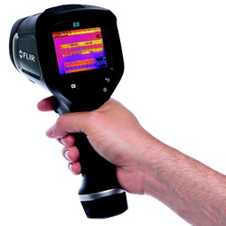 La FLIR E8 dispose d’un détecteur de 320 × 240, d’un objectif ne nécessitant aucune mise au point, d’un simple bouton de navigation pour accéder aux réglages de l’écran, de modes d’imagerie, d’outils de mesure et de JPEG enregistrés. La caméra est extrêmement simple à utiliser, même avec des gants et un seul pouce. La E8 permet également d’améliorer les images thermiques, grâce à la fonction propriétaire MSX® de FLIR, une fonction qui ajoute en temps réel sur toute l’image infrarouge des détails essentiels de la caméra à lumière visible.