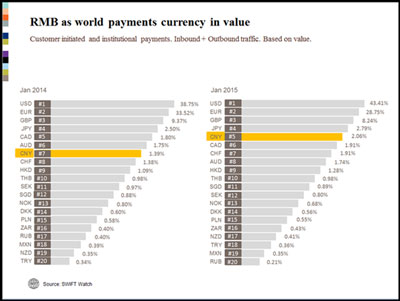 En janvier 2015, le RMB a tenu sa position de cinquième devise la plus utilisée au monde avec une part d’activité de 2,06 %. Dans l’ensemble, les paiements en RMB ont diminué de 10,22 % en valeur en janvier 2015 tandis que la baisse pour l’ensemble des devises de paiement était de 5,7 %.