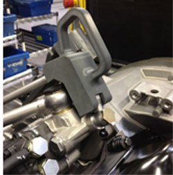 Ce support de tuyau imprimé en 3D (en gris) est utilisé pour maintenir en position un tuyau du moteur pendant son montage par lopérateur de la ligne de production
