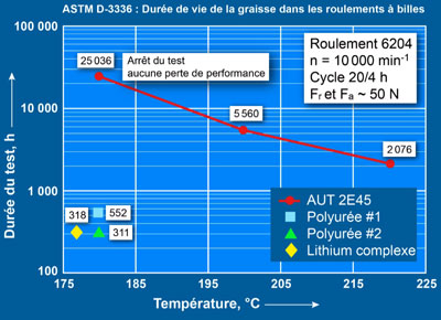 Les résultats de tests en laboratoire selon la norme « ASTM D-3336 : Méthode de test standard pour la durée de vie des graisses de lubrification des roulements à billes à haute température » ont clairement montré la possibilité d’une solution de lubrification réellement « à vie » des roulements à billes des moteurs électriques industriels. Lors du test de vieillissement accéléré, Krytox® AUT 2E45 conserve son excellente lubrification à long terme par rapport aux graisses normalement utilisées pour les roulements des moteurs électriques.