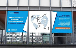 Une immense bâche, illustrée par le dessinateur Yak et son fameux Elyx, est affichée à l’entrée du campus Jussieu de l’UPMC