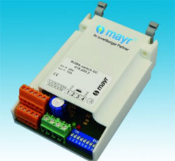 Fonctionnant à une tension de 24 ou 48 V CC, le nouveau dispositif de commutation intelligent de mayr® peut contrôler les freins dotés d’un courant nominal de bobine de 10 ou 5 A. Par ailleurs, la force de fermeture obtenue pour le rotor de frein peut ętre spécifiée à 25 %, 50 % ou 75 % de la tension nominale du ressort au moyen de deux entrées numériques. Un signal analogique continu compris entre 0 et 10 V est également possible. Le dispositif de commutation détermine sans utiliser de détecteur si le disque de freinage est attiré ou écarté. Cela permet d’ajuster le temps de surexcitation de la façon souhaitée. Étant donné que le dispositif de commutation intelligent enregistre l’état de commutation du frein, aucun microcontact ni détecteur de proximité n’est nécessaire comme cela est normalement le cas. Le système économise donc également des câbles. Le dispositif tient aussi compte des réserves d’usure possibles et, le cas échéant, détecte les dépassements de température autorisée. Grâce à sa compacité (30 mm de hauteur, 69 mm de largeur et 103 mm de longueur), il peut facilement être intégré aux armoires de commande.