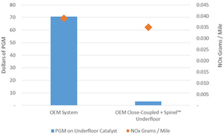 Le graphique récapitule les résultats des premiers tests de véhicules réalisés sur le modèle Buick Regal de 2014 dans un laboratoire indépendant appliquant les protocoles standard FTP. Ces résultats montrent les émissions d’oxydes nitriques (NOx) du système OEM, comprenant un catalyseur près du moteur et un catalyseur sous plancher, par rapport au catalyseur moteur OEM associé au catalyseur sous plancher Spinel de CDTi. Le coût en MGP correspond à celui du catalyseur sous plancher seul, calculé sur la base du cours des MGP au 1er mai 2015.