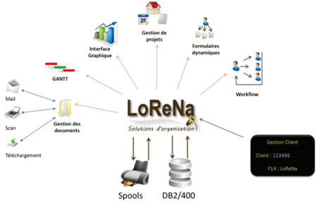 LoReNa peut interagir avec l’existant au niveau de la base de données, au niveau des programmes (par Web Services) et au niveau des impressions (mise en forme des spools, indexation, conversion en PDF et archivage).
