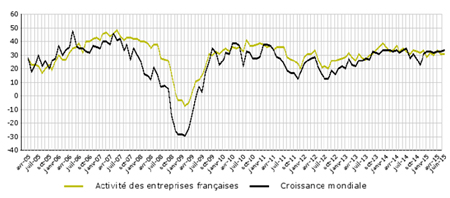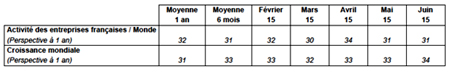 Les perspectives à un an de la conjoncture mondiale restent en moyenne remarquablement stables en juin. Toujours très dispersées selon les zones géographiques, elles atteignent les hauts niveaux d’avant la crise de 2007/2008 en Amérique du Nord, alors qu’en Asie la tendance au tassement se poursuit. Le climat des affaires reste médiocre dans les autres pays émergents et très réservé en Europe de l’Est (récession en Russie). Pour leur propre activité, les anticipations à un an des entreprises françaises dans le monde se tassent très légèrement en tendance depuis dix-huit mois. Peu dispersées selon les régions du monde, elles témoignent d’un optimisme plus mesuré qu’avant la crise de 2007/2008, ainsi que durant la reprise qui a suivi. L’Asie se distingue toujours par des anticipations très positives.