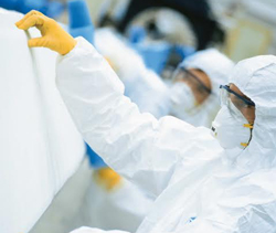 Le port d’une protection individuelle est obligatoire sur le poste de travail en raison de l’utilisation de colles et de résines. Il est également important pour l’opérateur de se protéger des poussières et salissures ambiantes générées pendant la production et les opérations de ponçage. Tyvek® Dual offre les caractéristiques de protection, durabilité et confort de la fibre Tyvek® sur la face avant, combinées à un dos en SMS alliant liberté de mouvement et respirabilité de la tête aux pieds pour un confort optimisé. Pour compléter ces caractéristiques de confort et de sécurité, la combinaison intègre également une cagoule 3 pièces ergonomique, des fermetures hermétiques aux endroits stratégiques et des coutures cousues extérieures pour une protection accrue contre la pénétration de l’extérieur vers l’intérieur du vêtement.