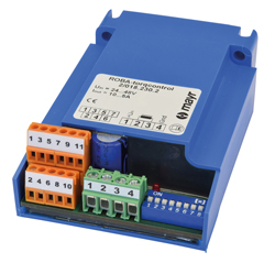 Le contrôle ciblé du couple de freinage s’effectue via le nouveau module ROBA®-torqcontrol. Cet équipement peut fonctionner à une tension de 24 ou 48 V CC. Il est capable de contrôler les freins dotés d’un courant nominal de bobine de 10 ou 5 A.