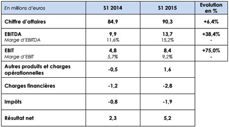 L’EBITDA est en progression de +38,4% pour s’inscrire à 13,7 M€, comparé à 9,9 M€ en 2014, soit une marge de 15,2% contre 11,6% au 30 juin 2014. L’EBIT s’inscrit à 8,4M€, en progression de 75% par rapport au 1er semestre 2014 qui s’élevait à 4,8 M€. La marge d’EBIT s’établit par conséquent à 9,2% sur le semestre contre 5,7% au 30 juin 2014.