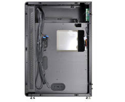 Dans le compartiment principal, deux disques supplémentaires peuvent prendre place sur le cache de l’alimentation, portant à un total de huit disques ! Trois ventilateurs de 120mm en aspiration sont installés sur un support avec fixation sans outil ; il peut être retiré via deux vis à main et remplacé par un radiateur de 360mm. Des trous sont situés sont placés à proximité des huits équerres PCI afin d’installer le kit de rétention PCI-01.
