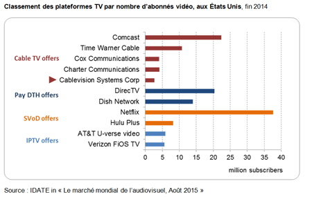 Cablevision, toujours comme les autres câblo-opérateurs, est aussi confronté à un début de changement de consommation de la télévision. Jusqu’alors, il s’agissait de multiplier les chaînes de TV basic et premium. Le patron de Cablevision a été le premier à dire que les câblo-opérateurs devaient se préparer à un changement de business model , qu’il fallait accepter de se monétiser comme une fat pipe.. Même si le cord cutting n’est pas massif, si les abonnés à Netflix gardent souvent des abonnements vidéo, le nombre de clients TV des câblo-opérateurs s’effrite. En effet, leur chiffre d’affaires TV ne représente plus aujourd’hui que 50% ou moins de leurs revenus globaux. Les revenus des accès haut débit (et maintenant surtout très haut débit) de Cablevision ont crû de plus de 10% l’année dernière ; on rappellera que HBO, le leader de la PayTV, a lancé son service de streaming (HBO Now) sur deux supports : AppleTV et Cablevision.