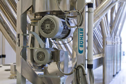Les machines utilisées au moulin d’Arnreiter sont principalement des systèmes créés par l’expert suisse des process industriels Bühler, qui travaille avec NORD depuis de nombreuses années et installe des entraînements de cette marque sur un grand nombre de machines. Les séparateurs et aspirateurs de Bühler servent à nettoyer et à classer les produits en grains comme le blé, le seigle, l’orge, l’avoine et le maïs. Les aspirateurs à recyclage d’air suppriment la poussière, les cosses, etc.Un ventilateur centrifuge crée un courant d’air qui soulève la matière et propulse les particules de faible densité dans un séparateur spécial, depuis lequel elles sont déchargées par un convoyeur à vis entraîné par un motoréducteur hélicoïdal NORD. Le produit lourd nettoyé est déchargé de la machine via des purgeurs de chambre.