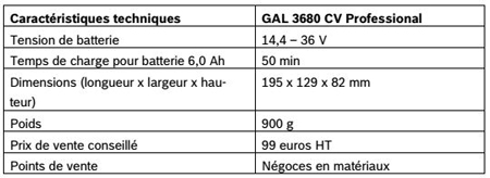 Les artisans qui utilisent sur leurs chantiers des outils sans-fil Bosch de différentes tensions n’ont désormais besoin que d’un seul chargeur pour recharger tous leurs outils. Compatible avec les batteries Lithium-Ion Bosch de 14,4 à 36 V, le GAL 3680 CV Professional, compact, fait gagner du temps aux professionnels : deux fois plus petit que le chargeur actuel AL 3640 CV Professional pour batteries 36 Volts, il permet une recharge deux fois plus rapide. Dans toutes les catégories de tension supportées, le GAL 3680 CV Professional recharge une batterie de 4,0 Ah en seulement 35 minutes, et une batterie de 6,0 Ah en seulement 50 minutes. Il est, par ailleurs, extrêmement robuste et dispose d’un logement de câble intégré.