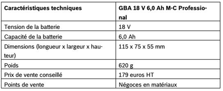 Les nouvelles batteries de 6,0 Ah ont également la particularité d’être très légères et très compactes : leurs dimensions sont identiques à celles des batteries Bosch 18 Volts de 3,0 Ah, 4,0 Ah ou 5,0 Ah existantes (11,5 x 7,5 x 5,5 cm) et leur poids est quasiment le même (620 g). Ces caractéristiques font des batteries 6,0 Ah les plus compactes, les plus légères et les plus performantes de la catégorie 18 Volts.