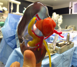 Le processus chirurgical de pointe, qui utilise des modèles imprimés en 3D en couleur et transparents produits sur l’imprimante 3D multi-matériaux couleur Objet500 Connex3 de Stratasys, est en cours de lancement au Département d’urologie et de transplantation rénale de l’Hôpital universitaire (CHU) de Bordeaux, en France. Selon le Dr Jean-Christophe Bernhard, chirurgien au CHU, c’est actuellement le seul hôpital en France, et l’un des premiers au monde, à employer la technologie multi-matériaux couleur de Stratasys pour les cas complexes de retrait de tumeurs rénales.