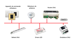 DALI (Digital Addressable Lighting Interface) est un protocole ouvert et un standard (IEC 62386) développé et soutenu par différents constructeurs, qui permet de gérer une installation d’éclairage par l’intermédiaire d’un bus de communication à deux fils