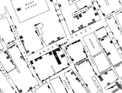 Une carte est un outil puissant pour présenter des informations, ces dernières étant toujours d’une manière ou d’une autre en relation avec une localisation. Cette relation à la localisation peut prendre plusieurs formes : des coordonnées géo-référencées, des adresses, des noms de lieux ou encore des positions géographiques par rapport à d’autres choses (par exemple, à 5 km au nord de Paris). Une carte s’impose d’elle-même quand il s’agit de rassembler plusieurs types d’informations, afin d’aider le lecteur à repérer rapidement la corrélation entre elles. Elle devient un outil d’analyse puissant afin de soutenir le processus de prise de décision. Un excellent exemple remonte à 1854, lorsque le Dr John Snow a cartographié une épidémie de choléra à Londres. En notant que les cas connus (représentés comme des piles sur la carte ci-dessous) étaient regroupés autour d’une pompe à eau particulière, il a découvert que la source de l’infection bactérienne était l’eau, et non l’air comme on le croyait alors.