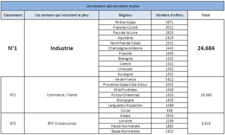 Dans 11 régions de France, c’est le secteur de l’industrie qui arrive en tête avec plus de 24.684 offres d’emploi au total. Le secteur du commerce et de la vente enregistre 19.366 offres sur seulement 7 régions juste devant le secteur BTP Construction à la troisième place de classement avec 8.619 offres d’emploi sur 4 principales régions.