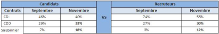 Cette tendance est également visible du côté recruteurs qui proposent durant la même période moins de CDI et plus de CDD et d’emplois saisonniers.